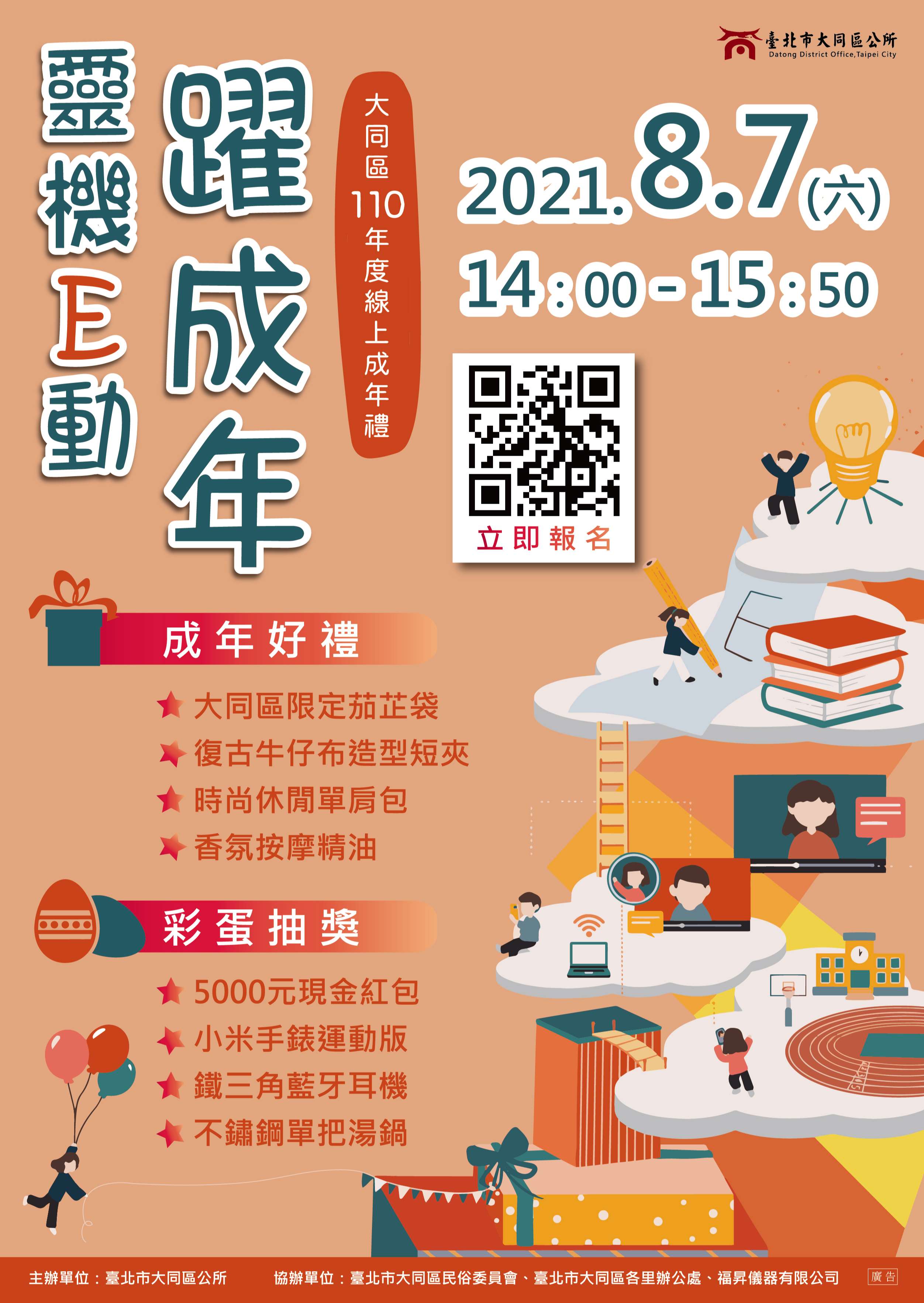 二、宣傳訊息內容如下:「臺北市大同區公所110年線上直播成年禮【靈機E動 躍成年】活動,將於110年8月7日(六)下午2時舉辦,獎品豐富,輕鬆溫馨,敬邀民國92、93年次設籍臺北市或就讀臺北市高中職、大專青年男女參加。即日起開放報名,活動詳情請參閱活動海報及報名表,洽詢電話(02)25975323轉806古小姐,報名網址請上https://forms.gle/y4zTkAFje89qm6Ga8。」